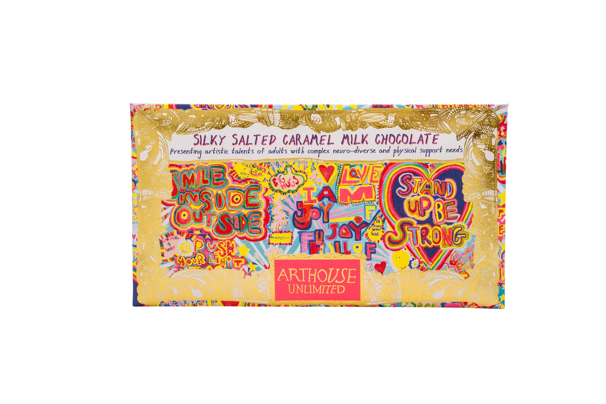 Wrapped in coloured foil & encased in a recyclable envelope, each bar features the ARTHOUSE Unlimited artists original artwork and presented in a shimmering gold or blue frame.